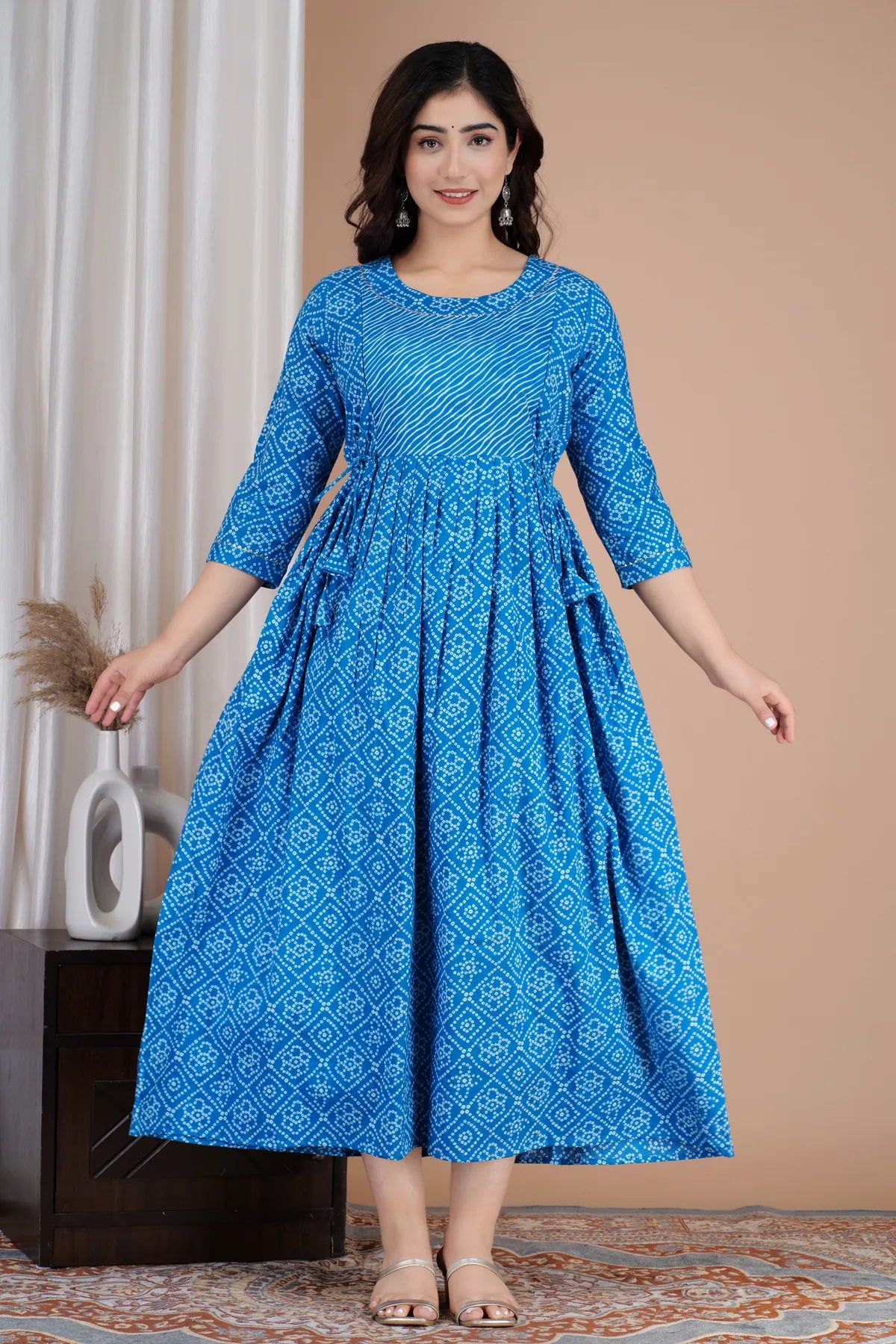 Step into serene style and ultimate comfort with this vibrant blue maternity and feeding gown. Crafted from 100% pure cotton and adorned with traditional Sanganeri hand block prints, it’s a perfect blend of Indian heritage and modern functionality ideal for every stage of motherhood.