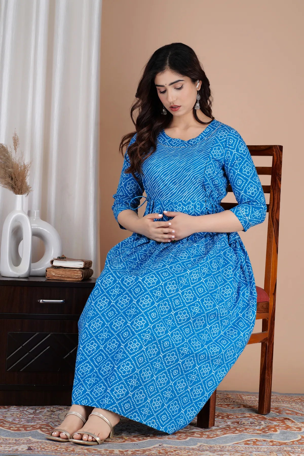 Make comfort look beautiful with this thoughtfully crafted blue maternity gown designed to make motherhood feel lighter and more stylish.