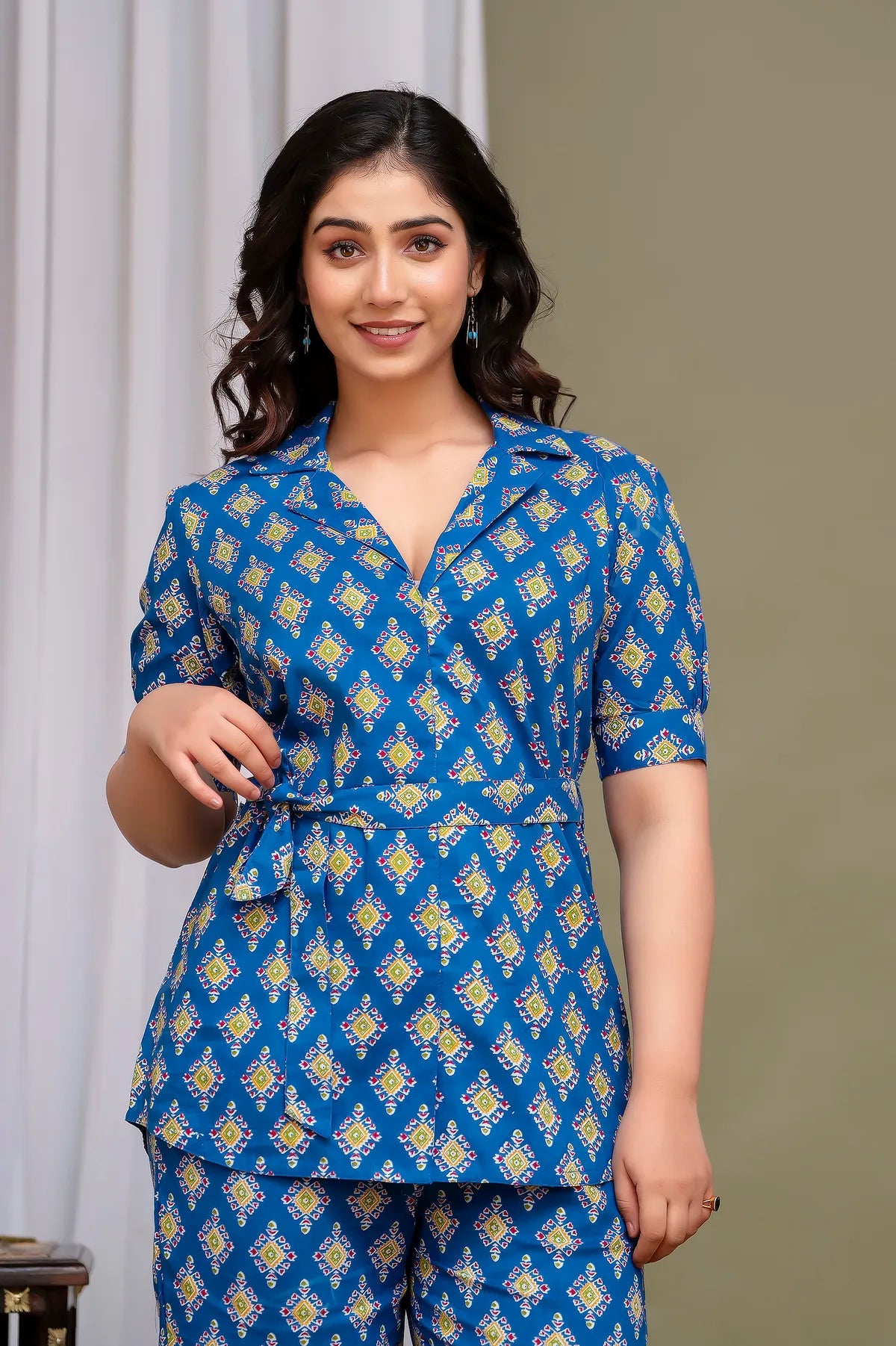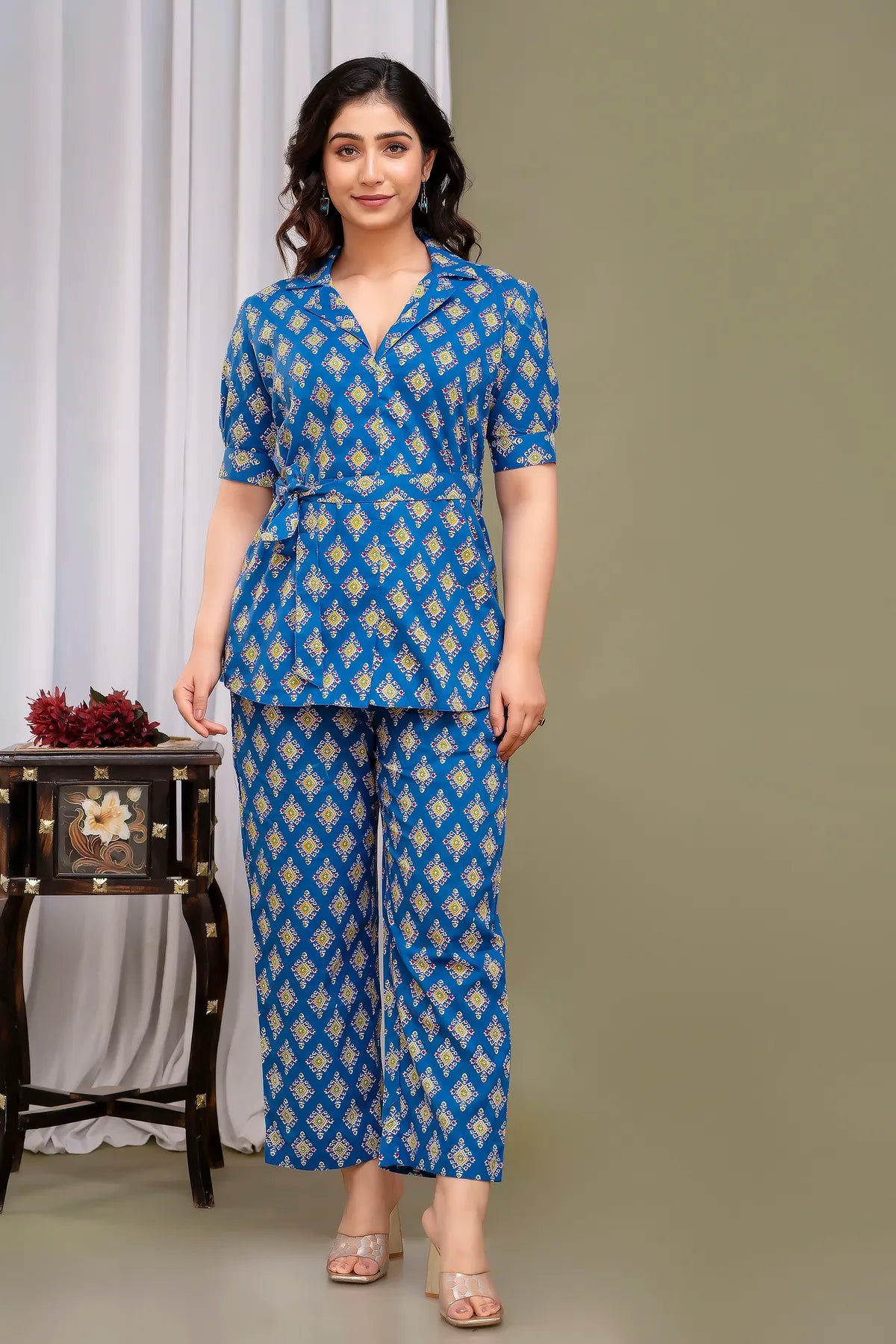Step into coordinated elegance with Asitya’s Blue Printed Cotton Co-Ords Set. This matching top and bottom set offers a harmonious blend of print detail and solid comfort, perfect for modern women who value both fashion and functionality.