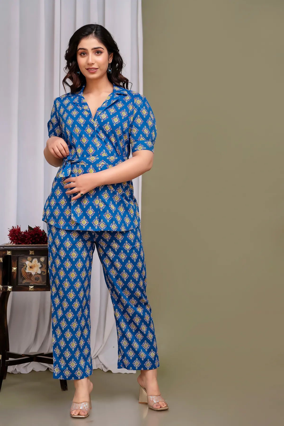 Blue Printed Regular Fit Solid Cotton Co-Ords Set for Women