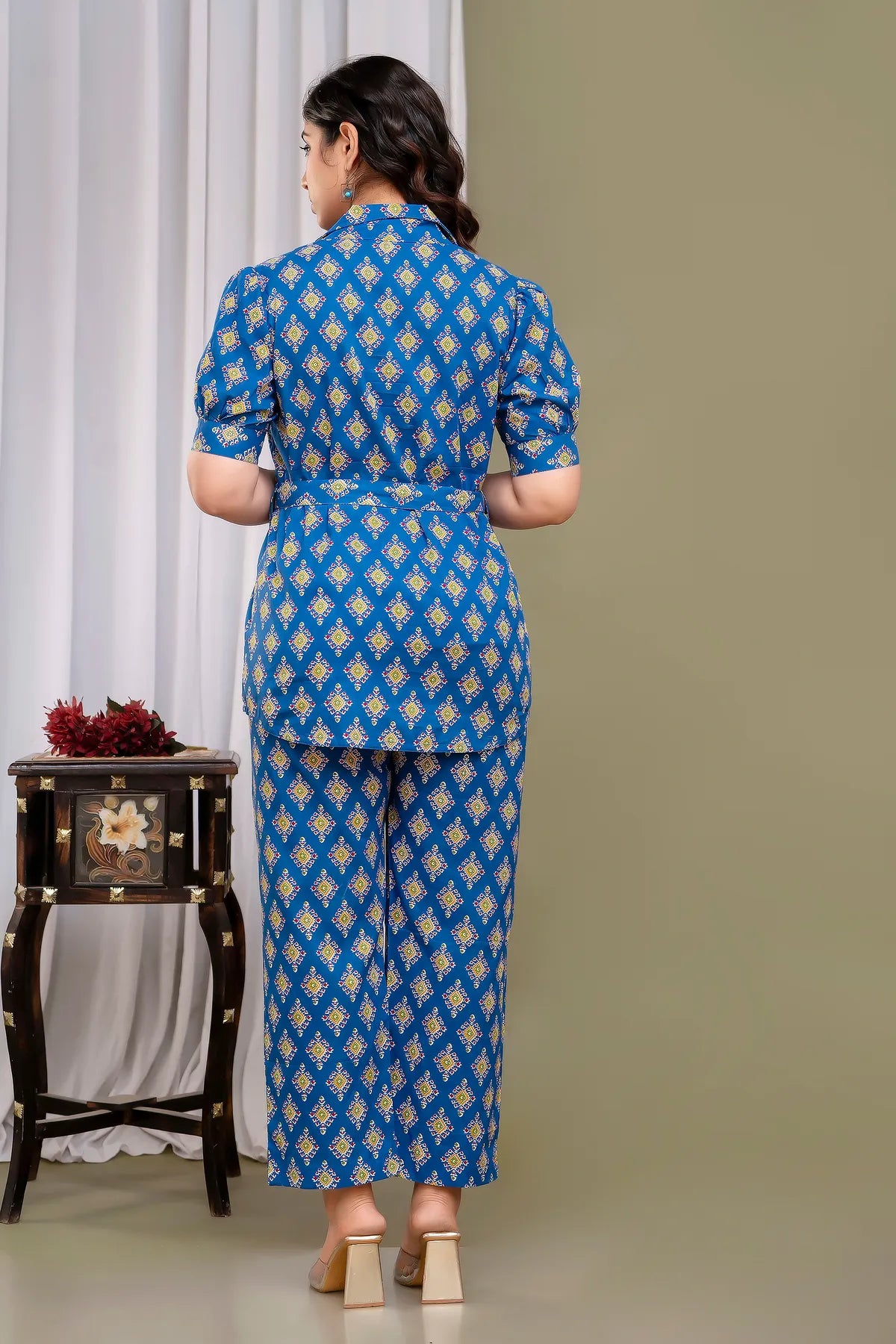 Blue Printed Regular Fit Solid Cotton Co-Ords Set