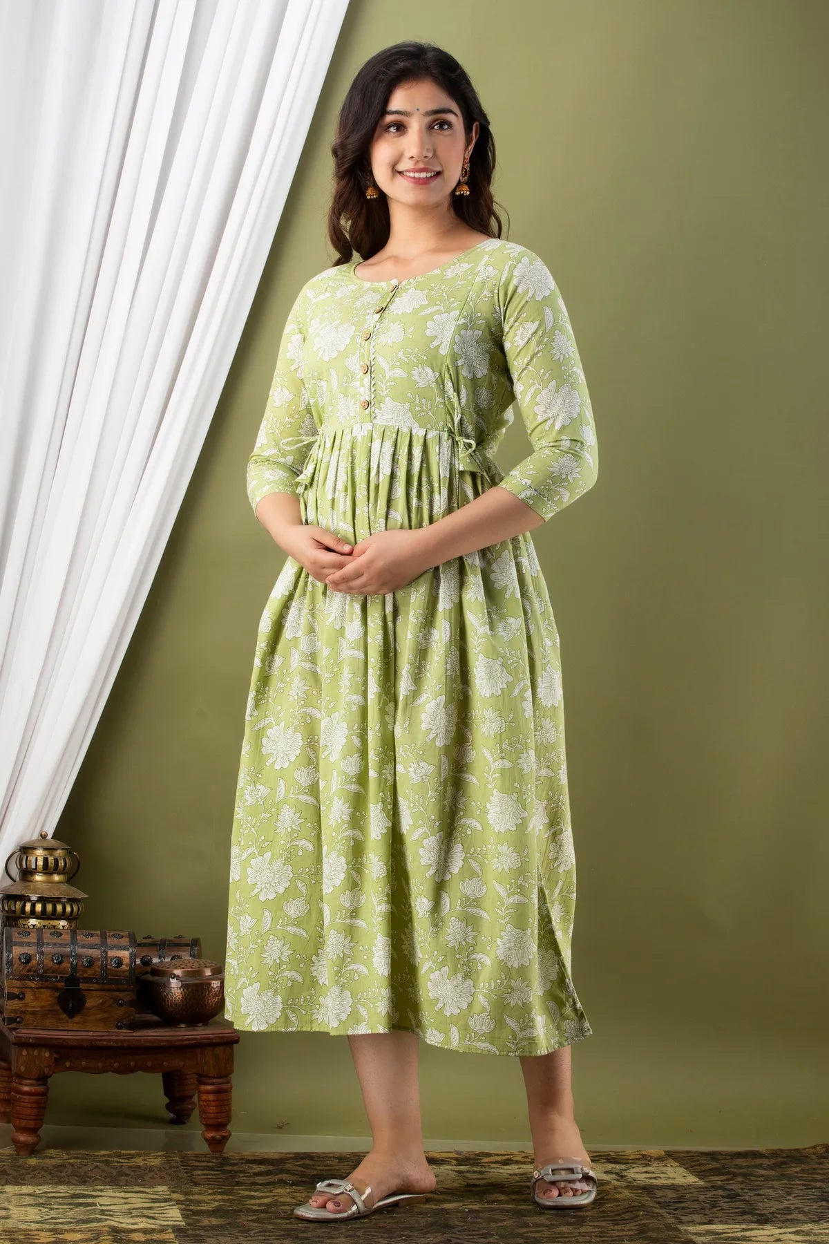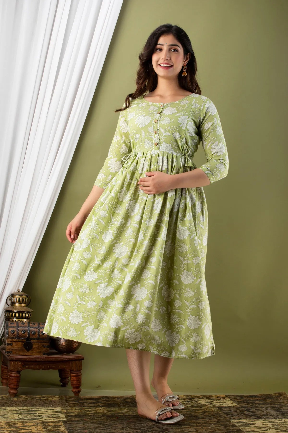 Breathe easy in the soothing charm of this Light Green Maternity and Feeding Gown, thoughtfully tailored for comfort, convenience, and cultural elegance. Made with pure cotton and adorned with delicate Sanganeri block prints, this gown is ideal for every stage of motherhood.